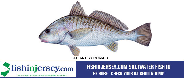 Atlantic croaker is a silvery fish with a faint pinkish bronze cast. Its back and upper sides are grayish with brassy or brown spots that form oblique wavy lines on the fish’s sides. Its body is moderately flat and elongated. The dorsal fins are continuous with a deep notch between the spiny and soft portions. It has a long head with a conical snout projecting beyond its downwardpositioned mouth. It has a slightly pointed tail and small barbels on the lower jaw. A member of the drum family, Atlantic croaker derives its name from the croaking sound it produces by vibrating its swim bladder. |