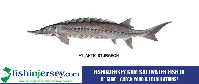 Sturgeon can be characterized by having an arched back with one row of bony plates or scutes. Their head is down sloped and their eyes are small. The bottom of their snout has four barbels or whiskers and the mouth is located on the underside of their head. Atlantic Sturgeon are brownish olive in color on top, grading to pinkish tan on their sides, to white on bottom. Since they are mostly cartilaginous, there are no scales. |