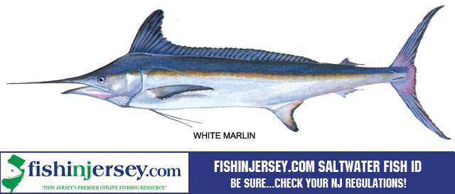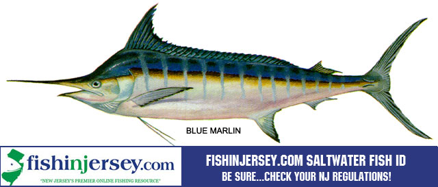 The body of the Blue Marlin is cobalt blue on top shading to a silvery white on the belly. The upper jaw is elongated in the form of a spear. There are approximately 15 blue vertical bars on the sides. The dorsal and anal fins are pointed, as opposed to the white marlin, which has rounded dorsal and anal fins. |