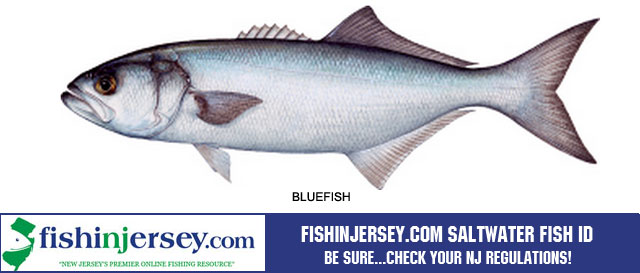 Bluefish are greenish-blue along the back fading to silver on the sides and the belly. They have stout bodies with large mouths and prominent, sharp teeth. The lower jaw juts out noticeably. The dorsal fin is divided into two sections with the first section about half as long and high as the second section. The second dorsal fin is nearly the same size as the anal fin. |