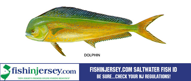 The dolphin has bright turquoise, green and yellow patterns, which fade almost immediately upon death. Its body tapers sharply from head to tail and has irregular blue or golden blotches scattered over the sides. Dolphins have a single dark dorsal fin extending from just behind the head to the tail. |
