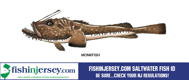 The Monkfish is easily recognized by its large spiny head and wide mouth filled with fang-like teeth. They have very broad, depressed heads (The head is as wide as the fish is long). They have enormous mouths with long, sharp teeth. Monkfish have a modified spine called an “esca.” This spine is quite mobile and can be angled forward so it can dangle in front of the fish’s mouth and be wiggled like bait to lure its prey. |