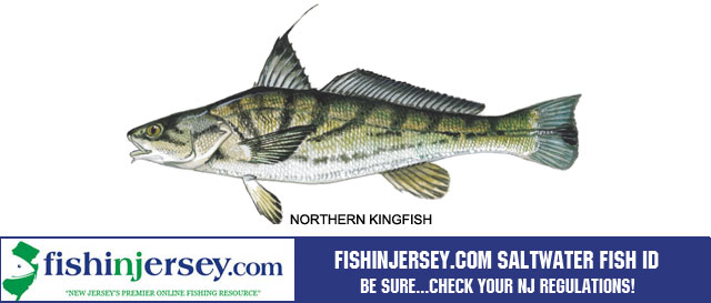 Northern kingfish are part of the drum family. Since they lack an air bladder, Northern kingfish do not make typical “drumming” sounds like other members of the drum family, but they can vocalize somewhat by grinding their pharyngeal (throat) teeth. Notable characteristics are the long spine on the first dorsal fin and a barbel on the chin. Dark, irregular bars are present along the body of the fish. The first two bars form two distinct V-shapes. The bold markings and a dark longitudinal stripe behind the pectoral fins distinguish it from the two other species of kingfish. The markings on Southern kingfish and Gulf kingfish are not nearly as prominent and do not form the V-shaped pattern. |