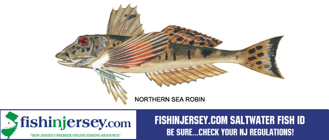 The northern sea robin is distinguishable by a large, spiny head and tapering body. It can be easily identified by its rounded, fanlike pectoral fins that are so large they overlap the anal and second dorsal fins when laid back. The three lower rays of the northern sea robin’s pectoral fins are long, broad feelers used to walk along the bottom, stirring up bottom sediments to find food. The head of the northern sea robin is encased in bony plates, which it uses as a shovel to dig up invertebrates from the mud. The front part of its upper jaw is concave, and there is a small spine in its nostrils. The northern sea robin’s eyes are a distinctive peacock blue. The features of its head distinguish this species from a similar-looking fish, the sculpin. These fish often produce an audible “croak” when held out of the water. |