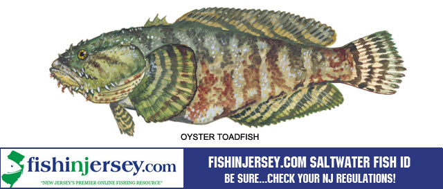 Oyster toadfish are often described as ugly. They have broad, flat heads with bulging eyes and fleshy protrusions. The skin is slimy and scaleless. It is brownish yellow with mottled brown vertical bars. Oyster toadfish make a grunting sound when alerted to food. |