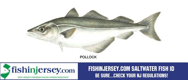 Pollock are olive green or black to brown above with paler sides and a silver belly. Their fairly straight lateral line is light colored. Pollock are deep, plump bodied fish that have three dorsal fins, two anal fins and a forked tail fin. They have a slightly projected lower jaw. Their chin barbel is considered minute and may be completely missing in older fish. Pollock average between 4 and 15 pounds in weight, although large ones can weigh to 35 pounds. |