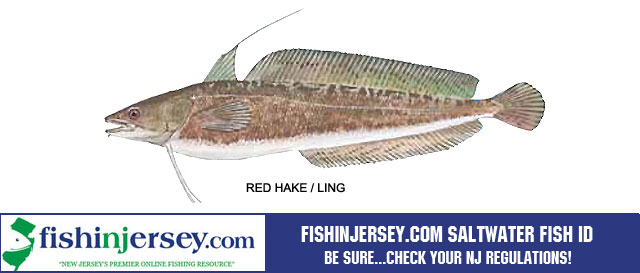 Also called “ling” or “ling cod”, the red hake is similar to the silver hake. The red hake has a short first dorsal fin with a distinctive elongated filament and a long second dorsal fin. The red hake also has a single chin barbel. The caudal fin is rounded. Coloration is brownish to grayish brown, with some hints of red along the back and upper sides which fade to a yellowish, off-white belly. Red hake average under 2 pounds, but can be caught up to 9 pounds. |