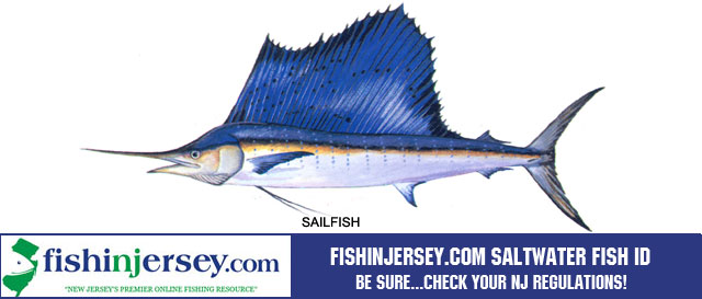 Sailfish are dark-blue along the upper half of the body fading to brownish-blue on the sides to silver-white on the belly. The upper jaw is elongated, looking like a spear. The first dorsal fin is high and sail-like, blue-black and covered with small black spots. All related billfishes have a high dorsal fin as juveniles, but only the sailfish retains the high fin throughout life. On the sides are 15 to 20 vertical bars consisting of several small blue spots. |