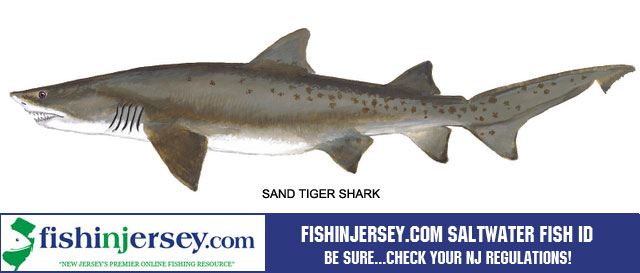 The sand tiger shark has a stout body with two large dorsal fins that are almost equal in size and the first dorsal fin placed far back on the trunk of the body. The tail has an elongated upper lobe and no caudal keel. This shark appears bronze from above but is increasingly paler below. Juveniles have reddish or yellow-brown spots on the tail and rear end of the body that fade with age. The gill slits are anterior to the origin of the pectoral fins. |