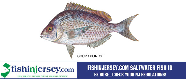 Porgies have a variety of sub-species. Porgy (or Scup) are typically high-backed, snapper- or grunt-like fishes with deep, oblong bodies. They have a single dorsal fin, and and their small mouths, equipped with strong strong jaws and teeth, can handle a diet of fishes and hard-shelled invertebrates. The species average about 16 inches long, and their average weight is about two pounds. However, many sub-species of Porgy or Scup can be much smaller on average. Color varies greatly between species as well. |