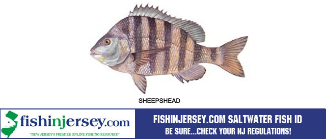 Sheepshead are greenish-gray with a laterally compressed body marked by five or six vertical dark bars on the sides. They have prominent teeth with incisors, molars and rounded grinders that enable them to crush shellfish and sea urchins. They have strong, sharp spines on the dorsal and anal fins. |