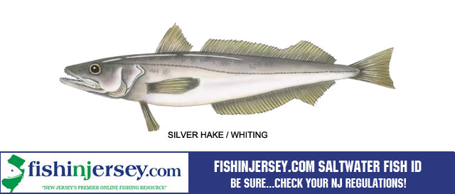 Also called “whiting”, silver hake are iridescent gray brown above, fading to a silvery shade below. Their large mouth, with a projecting lower jaw, is lined with two or more rows of sharp curved teeth. Silver hake have no chin barbel. Being slender fish, they are five to six times as long as they are deep. They have two separate and well developed dorsal fins, the second being much longer than the first. They also have an extended anal fin, and their ventral fins lack the long feelers that are so obvious on other hakes. Adult silver hake normally measure around 14 inches in length. |