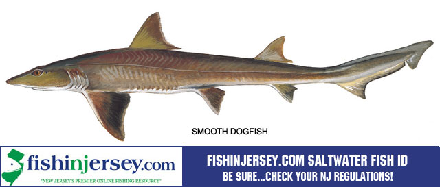 Smooth dogfish have a slender body with two dorsal fins nearly equal in size. The second dorsal fin sits slightly ahead of the anal fin. They have cat-like eyes and are a tan-gray, slate-gray or brown on top with a white, grayish-white or yellowish belly. |