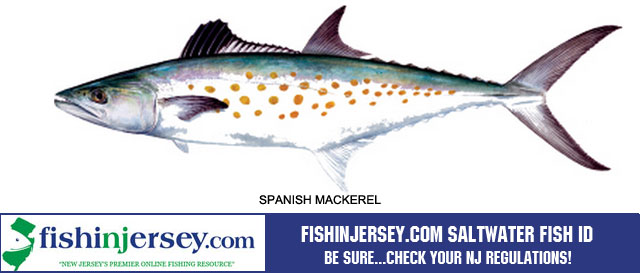 Spanish mackerel have greenish backs with silvery sides and belly. Golden yellow spots above and below the lateral line cover the sides of the body. The front of the first dorsal fin is black. The lateral line curves gently to the base of the tail and the body is covered with tiny scales. |