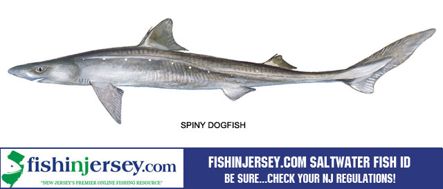 Spiny dogfish are slender with a depressed head and a pointed snout. Their dorsal side is gray to brown and their ventral side is pale gray to white. Their eyes display an iridescent blue-green coloration in the pupils. They have white spots on their body, with a single spine in front of each of their two dorsal fins. The second dorsal fin is smaller than the first but has a larger spine and spiny dogfish do not have an anal fin. |