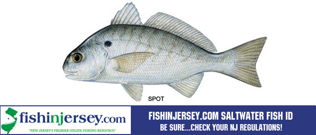 The body of the Spot is short and grayish-silver with golden reflections along the upper sides. Between 12 and 15 wavy dark lines run from the dorsal fins to below the lateral line. A prominent black spot, about the same size as the eye, is located behind the gill cover. In the fall, spot have bright yellow stomachs, a trait likely associated with spawning. |