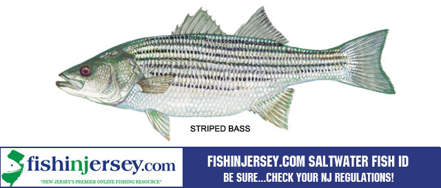 Striped bass have a large mouth with a long body and head and slightly forked tail. Their color on top varies from a dark olive-green, to steel blue or gray black. Their sides are silver with seven or eight black, horizontal stripes, one of which follows the lateral line. They have one soft and one spiny dorsal fin, separated at the base. /td> |