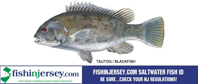 The tautog is a stout fish with a blunt nose and thick lips. Large conical teeth at the front of the mouth recede to flat crushing teeth used for eating hard-shelled prey. Coloration is dark green to black dorsally, mottling to a lighter background color on the sides. Adults average 1 to 1.5 pounds. |