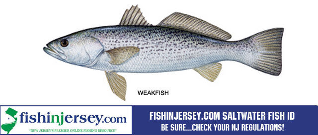 Weakfish are dark olive-green on top and silvery below, burnished on the back and sides with purple, lavender, green, blue, golden or copper. The sides are flecked with dark blotches that form wavy lines running down and forward, but not into the fins. The fins are yellow, and there are two large canine-like teeth in the upper jaw. The spot pattern distinguishes weakfish from the spotted seatrout because the spots do not appear on the tail or second dorsal fins. |