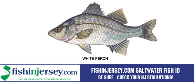 White perch are silvery chunky-bodied fish, about 2 ½ or three times as long as they are deep, not counting the tail. The back is olive-brown to blackish-green with the color shading to a paler silvery- green on the sides and silver-white on the belly. The fins are dusky. A tiny notch separates their two dorsal fins. Young fish, with dark lateral stripes, may resemble striped bass. The stripes on an adult white perch are very faint or non-existent. |