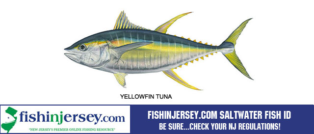 Yellowfin tuna are torpedo-shaped fish that are a metallic dark blue on the back and upper sides with a yellow belly that changes to silver. The dorsal and anal fins, and finlets are bright yellow. It has elongated anal and dorsal fins. |